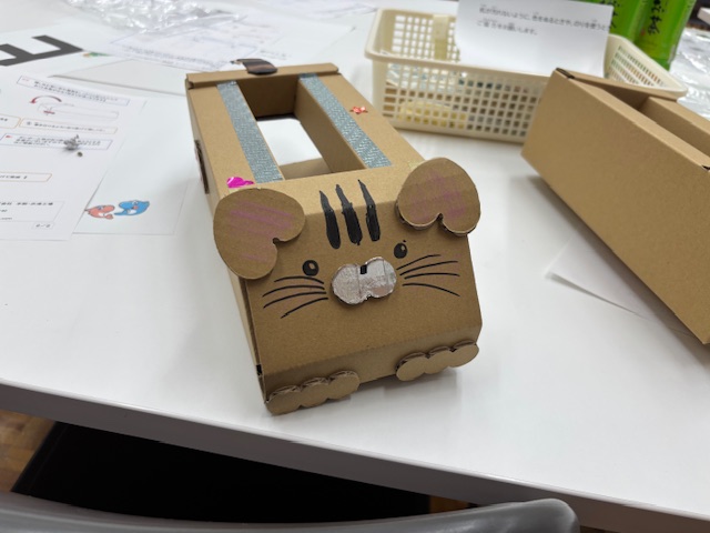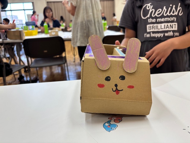 第2部はトミタパックス株式会社さまを講師に迎え、環境にやさしい段ボールを使った「オリジナルティッシュボックス」を作りました。子供たちは自由に色を塗ったりシールを貼り、一人一人が自分だけのティッシュボックス作りを楽しんでいました。