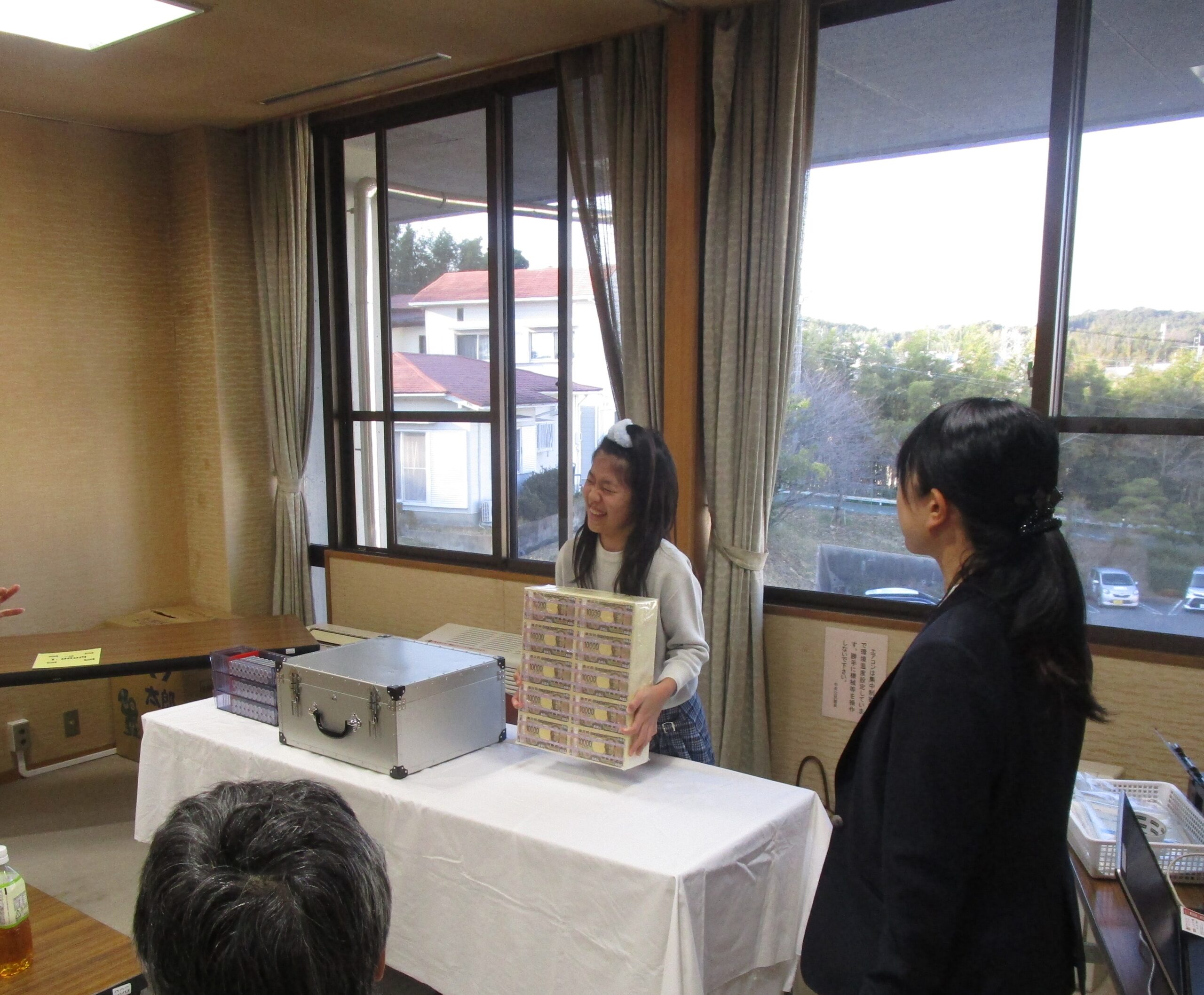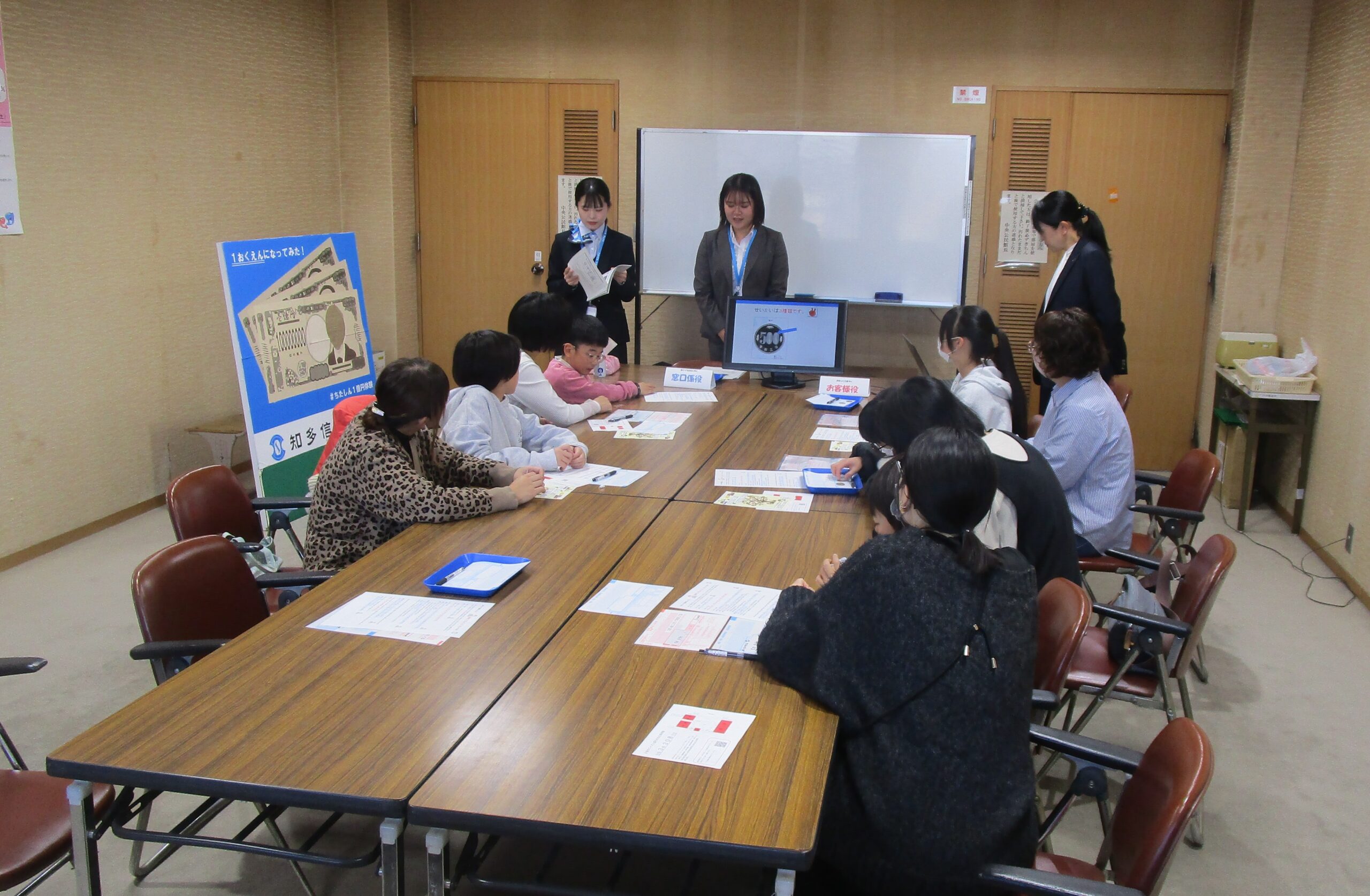 当金庫職員からは、お札を早く正確に数える方法の「札勘」を伝授!みなさん、上手に数えていました。